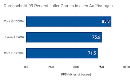 The Intel Core i5-13600K provides a bridge between price and performance. It launched with a moderate price tag of 376 francs. In games, it delivers more than 90% of the performance of its older sibling, the Core i9-13900K for only half the price – all while staying cooler and gobbling up less power. It manages to beat the AMD Ryzen 7 7700X, currently priced at 441 francs, in most games and especially at 99 and 99.9%. In productivity benchmarks, they usually come out head-to-head.