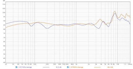 The frequency response measured with the miniDSP confirms my impression: the DT 770 Pro (blue line) has louder deflections in the low bass range.