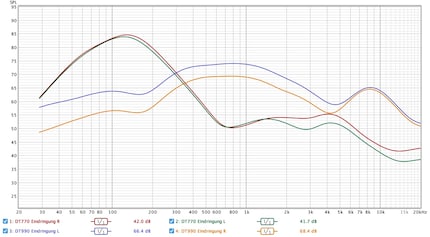 Of course, the results of this tinkering should be taken with a pinch of salt. Broadly speaking, the result matches my listening experience. The curves show that low frequencies are louder from the outside with the 770 (red/green) than with the 990, while high frequencies are quieter.
