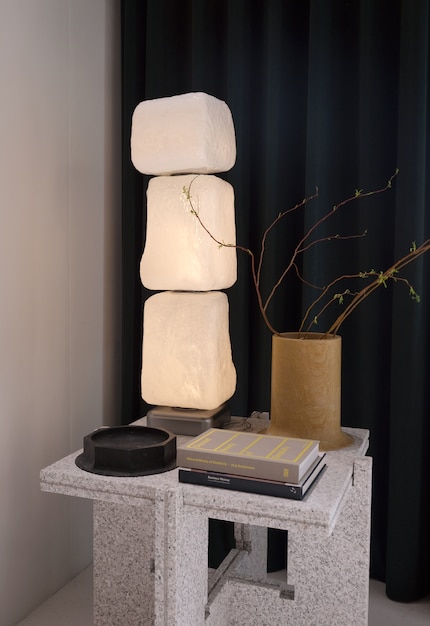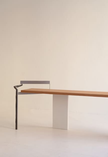The Temporanea Galleria was perhaps the only place where I was allowed to walk through the exhibition without shoes, which suited me just fine on 20,000-step days. But it was also one of the few events that did without an imposing building and yet still stood out. The entire gallery was lined with wrapping paper. Apart from a small piece of raw plaster near a hole, nothing of the architecture was visible. Guglielmo Giagnotti and Patrizio Gola were behind the simple yet effective concept. They are the founders of Studioutte, a Milan-based multidisciplinary office for interior architecture, decoration and collector design. Their staging struck me as just as hybrid as their understanding of design. Especially the table, which reached through the aforementioned hole in the wall into the next room.