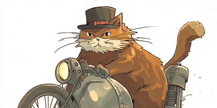 The input for this anime-style image is: A cat with a top hat and monocle riding a unicycle. The cat and top hat worked, but instead of a unicycle the result is a tricycle and I miss the monocle completely. But the result is still cool.