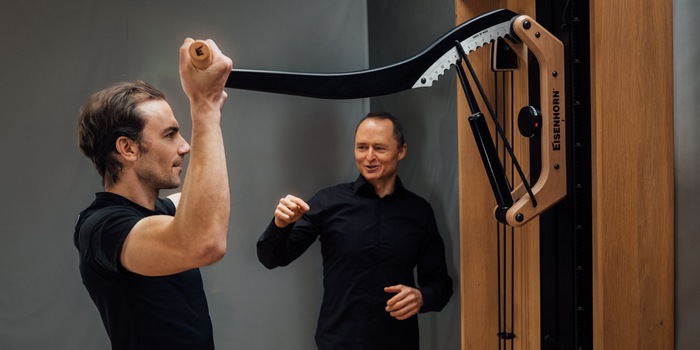 A me il gilet con i pesi non serve. Mike regola l’Eisenhorn su spinte per le spalle. Una presa sulla manopola, spinto il carrello in posizione e ruotato di 180 gradi in modo da poter spingere verso l’alto contro la resistenza del pistone. Poi avvia «Mike5». Il concetto di allenamento è disponibile su abbonamento per una tariffa base mensile. Le spiegazioni sulla corretta esecuzione di oltre 100 esercizi con barra, carrucola e banda di presa, invece, sono gratuitamente disponibili. Mi apre il timer dell'intervallo, che oggi specifica quattro serie di 50 secondi ciascuna. Tra ogni serie vi è una pausa di 80 secondi prima di continuare a piena potenza.
