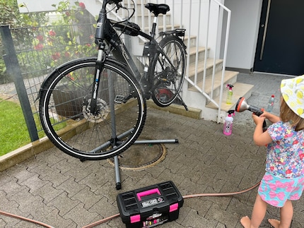 Ora sì che ci si diverte: insieme, risciacquiamo la bici con la canna dell'acqua. Il ciclo di lavaggio è concluso. Tuttavia, l'«ultimate kit» richiede altri due passaggi da parte nostra: manutenzione e cura.