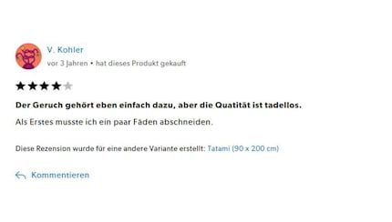 Il tatami è un prodotto naturale e lo si sente. I primi giorni non capivo da dove venisse questo odore così stantio. Si sarà ammuffita la terra nei vasi? O sono le mie lenzuola? – mi chiedevo. Alla fine ho capito che si trattava del tatami. Ma da quando so da dove proviene, l'odore non mi dà più alcun fastidio. Anzi, mi fa quasi sentire bene. Eppure, le valutazioni degli utenti dell’unico tatami del nostro negozio sono alquanto ambivalenti. Per alcuni l’odore fa parte del tatami stesso nel senso positivo, mentre per altri rappresenta un chiaro fattore negativo.
