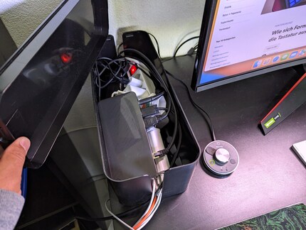 Potrei montare la presa multipla con gli adattatori e la docking station sotto il piano della scrivania. Tuttavia, decido di usare una scatola nascondi cavi in modo da essere flessibile e non dover installare nulla in modo permanente. Naturalmente potrei anche ottimizzare un po' lo spazio con i caricatori, ma non voglio produrre ulteriori rifiuti elettronici e buttare via caricatori ben funzionanti solo perché esistono versioni più compatte con più connessioni che renderebbero tutto uniforme.