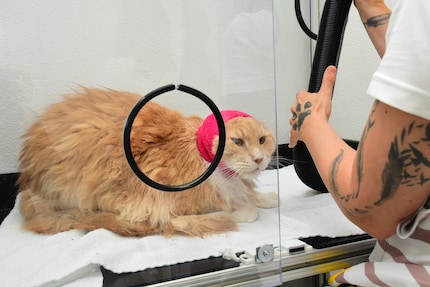 Passiamo al primo box di vetro per asciugare. Qui i gatti vengono «preasciugati». Come in un autolavaggio, penso. Nella seconda stazione di asciugatura si passa ai dettagli. Cécile Riner mette una specie di fascia rosa sulla testa di Franky. «Sembra un po' brutale, ma non lo è affatto. Il tessuto attutisce il rumore e calma i gatti», spiega Cécile Riner. Prende un tubo e soffia via i peli allentati e già asciutti di Franky. Il soffice gatto Maine Coone può di nuovo uscire dal box di vetro. Ora inizia il trattamento vero e proprio.