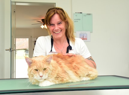 Vedremo tra poco cosa significa con Franky. È uno dei sei Maine Coon di Cécile Riner. Quando la 41enne lo porta giù dal suo appartamento sopra il salone, pende dalle sue spalle come una sciarpa. Non posso fare a meno di sorridere, non ho mai visto un gatto così rilassato. Rimarrà così per tutto l'appuntamento? Cécile Riner mette Franky sul tavolo veterinario motorizzato di fronte a lei e lo solleva.