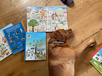 I miei figli sono sdraiati a pancia in giù sul pavimento con i libri di oggetti nascosti di grande formato di Rotraut Susanne Berner davanti a loro. Mi piace guardarli mentre si immergono in queste immagini colorate. A volte mi ci immergo anch'io. Poi guardiamo insieme mentre i gattini diventano più grandi, il pappagallo decolla e l'asilo viene completato. Scopriamo novità ogni volta che le guardiamo, anche per la centesima volta.