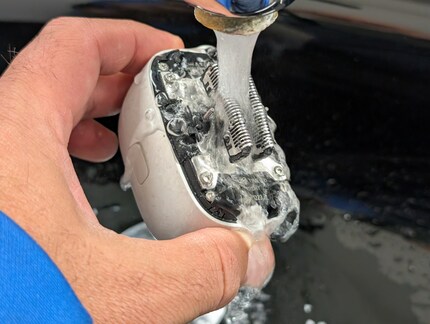 Fortunatamente, il Panasonic 900 S è impermeabile e progettato anche per la rasatura a umido. Quindi mi inumidisco il viso e comincio. In effetti, la mia pelle la tollera molto meglio. Posso concentrarmi completamente sulla procedura e rendermi conto rapidamente dei vantaggi e degli svantaggi dell'apparecchio.