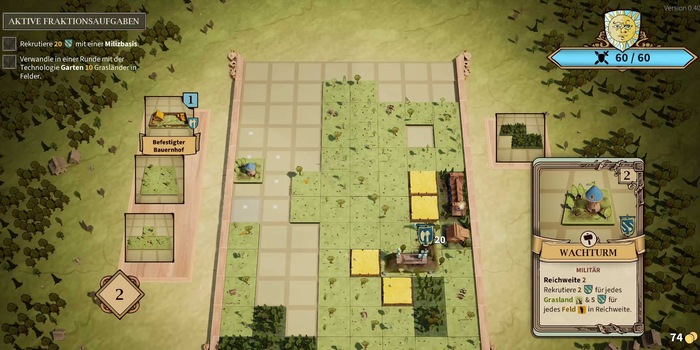 Oltre ai blocchi del paesaggio, ci sono anche edifici unici che cadono casualmente dall'alto. Mi danno bonus speciali o addirittura reclutano un esercito. Prima di ogni partita, posso selezionare un certo numero di edifici di questo tipo e quindi comporre strategicamente il mio mazzo.