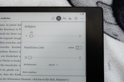 Se ti piace leggere a letto la sera, dovresti proteggere gli occhi dalla luce blu. A questo scopo, è disponibile la funzione «Luce naturale», un filtro per la luce blu. Per questo si può attivare un timer. È inoltre possibile regolare la luminosità del display in modo da ottienere una buona immagine anche fuori, in pieno sole.