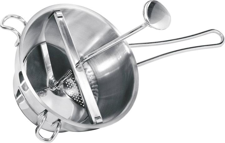 La meccanica robusta gestisce facilmente qualsiasi alimento da passare. Il nuovo disco di attrito, grazie alla sua superficie ruvida, consente anche il passaggio di porri, asparagi e altri alimenti fibrosi. La forma a imbuto garantisce un'ottimale scorrevolezza degli alimenti da passare. I dischi forati sono facilmente sostituibili. Il raschietto efficace garantisce un utilizzo completo degli alimenti da passare. Questo passaverdure è ideale per la preparazione di cibi sani e freschi per neonati e bambini. È possibile preparare rapidamente le più fini puree di verdura e frutta con il vantaggio incomparabile della qualità alimentare naturale e non contaminata. Per la pulizia, il meccanismo di mescolamento si solleva facilmente. È lavabile in lavastoviglie e include due dischi intercambiabili con fori da 2 e 3 mm.