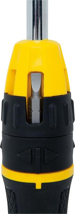 Cacciavite Multibit Stanley con portabit magnetico e meccanismo a cricchetto brevettato a 3 posizioni. Il cacciavite è fornito con 10 inserti esagonali: PH1, PH2, PZ1, PZ2, fessura 5 e 6,5 mm, quadrato (Robertson) n. 1 e 2, Torx T10 e T15. Gli inserti possono essere riposti in modo visibile e sicuro. Grazie al sistema di cuscinetti a sfera a molla, si ha un accesso semplice e rapido agli inserti. Gli inserti sono sempre a portata di mano. La lama è in acciaio inossidabile cromato. Il manico ha una forma trilobata e una superficie stampata per una buona presa.